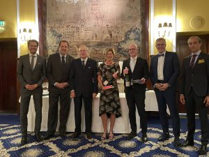 Bildunterschrift: Festliche Siegerehrung im Excelsior Hotel Ernst (v.l.n.r.): Achim Kockjoy, Präsident des Lions Clubs Köln-Agrippina; Thomas Luber, Vorsitzender des Fördervereins des LC Köln-Agrippina; Alfred Uschkamp, Spielführer des Golf- und Landclubs Köln; Claudia Phillipps, Siegerin der Bruttowertung; Prof. Leonhard Bastian, Chefarzt im Klinikum Leverkusen; Andreas Wolter, Bürgermeister der Stadt Köln; Prof. Joern Michael, Vizepräsident des LC Köln-Agrippina.